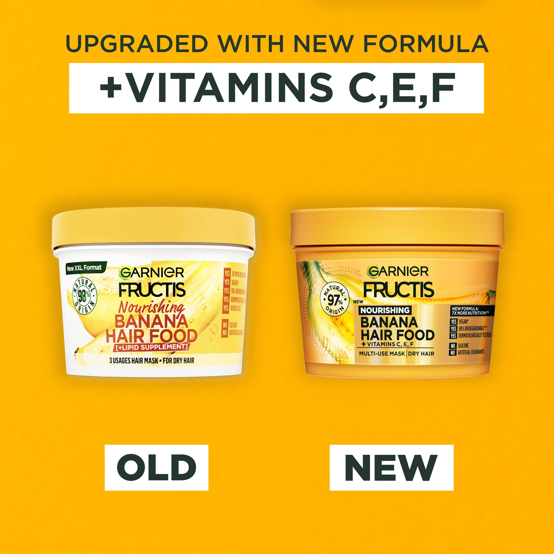 Garnier Fructis Banana Hair Food Multi-use Mask, Nourish dry hair, 7X more nutrition, Boosted with Vitamins C, E, F, 350ml, Made of 97% natural origin ingredients, No silicone, No artificial colourants, Cruelty Free, Vegan, Made of 100% recycled plastic.