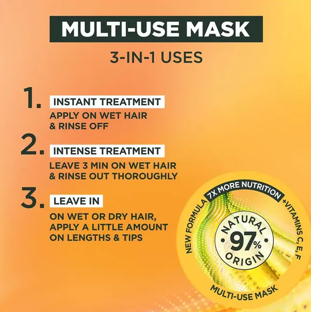 In 1 use, deeply nourishes your hair up to 7X more nutrition*. *Instrumental test after application of the mask as a rinse off.