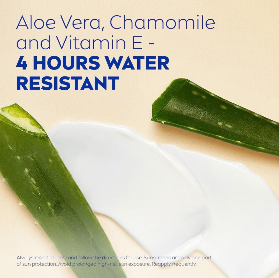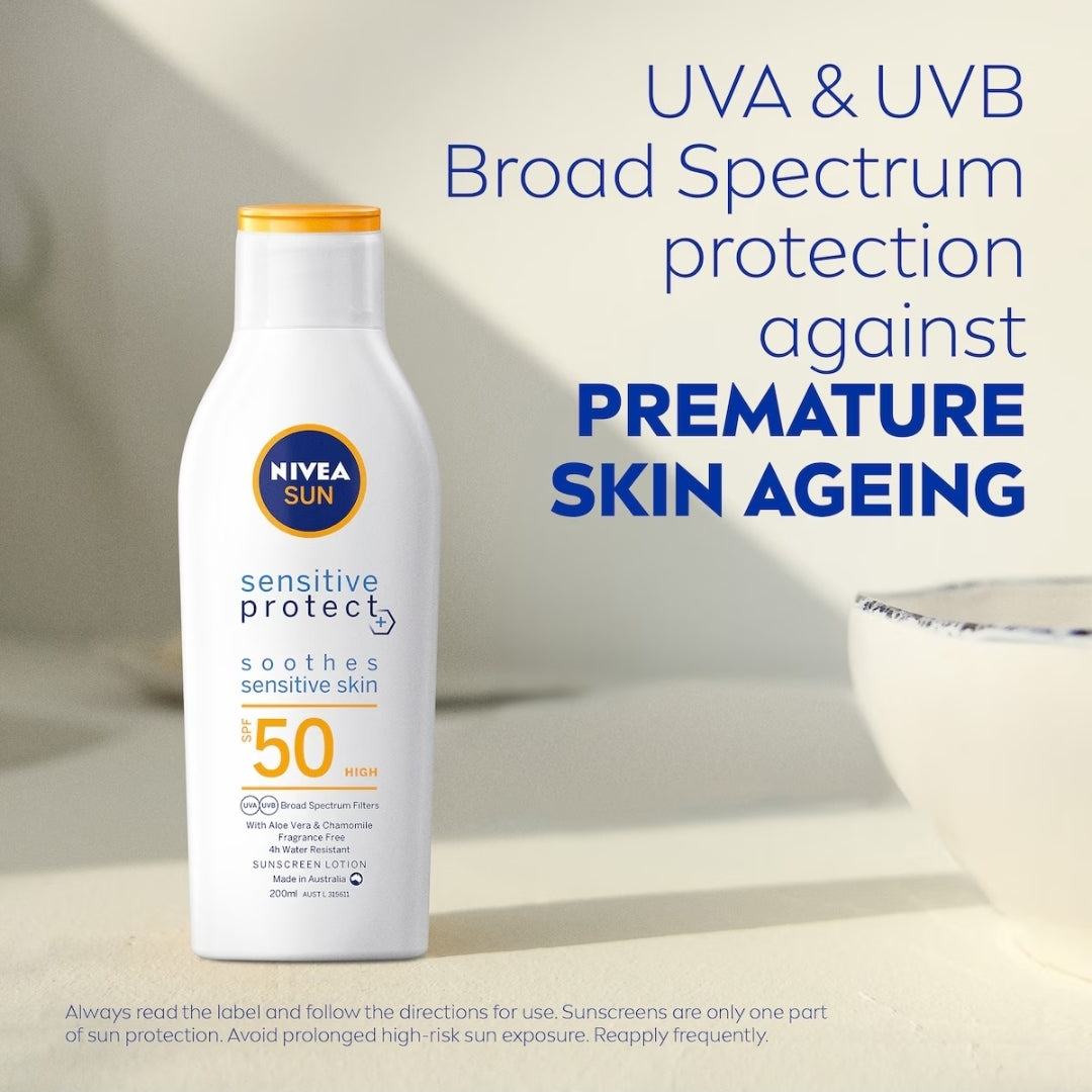 NIVEA SUN Sensitive Protect Sunscreen Lotion SPF50 cares for your skin in more ways than one, combining broad spectrum sun protection whilst being suitable for sensitive skin. Highly effective UVA and UVB filters shield skin from sun damage. The non-greasy formula helps to soothe and calm reactive skin, made with quality ingredients such as Aloe Vera and Chamomile. Plus, the fragrance free formula with moisturising Vitamin E helps protect and repair the skin by keeping it hydrated resulting in it being less vulnerable to sun damage. The skin compatibility of this sunscreen has been dermatologically tested and approved. Made in Australia.